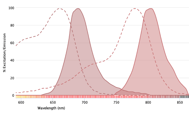 - Near-IR CF® Dyes – manufactured by Biotium, eight Near-IR CF® Dyes are currently available, with emission maxima spanning 720 to 896 nm.