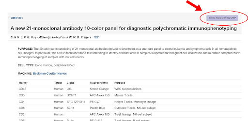 - Users can search for relevant OMIPs at https://app.fluorofinder.com/omips. Once one is found, researchers may select “Build a Panel with this OMIP” to launch the Flow Cytometry Panel Design Tool where users will go through the panel design process starting from the OMIP framework.