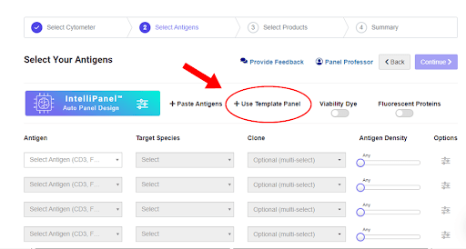 2. Users may also utilize an OMIP directly within the FluoroFinder Panel Design Tool workflow. First, users must select their desired cytometer. On the next step, “Select Antigens”, users can select “Use Template Panel” to review and select the desired OMIP. Once an OMIP is chosen, users can select the antigens of interest described in the OMIP to populate their panel. Once users complete this step and proceed to “Select Products”, the panel is populated with the fluorochromes and products denoted in the OMIP. Users may then make any desired modifications to the experiment.