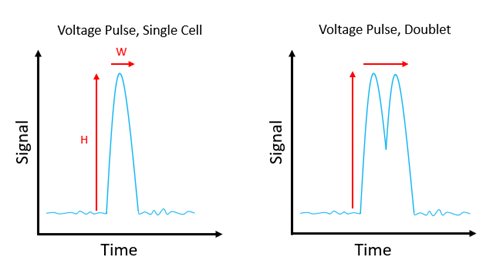 Each event is characterized by its height (H) and width (W) – equating to the PMT output and the time taken for the cell to pass through the interrogation point, respectively; it also has an area (A), which is a property of both H and W. Critically, for something to be considered an event, not only must the signal generated by the PMT be greater than the threshold set by the end user to reduce unwanted background signal, but it must also return to baseline levels. Where two cells pass through the interrogation point close together, the voltage pulse may not drop back down to the baseline between them, and it is this that can result in their mistaken classification as a single, large event.