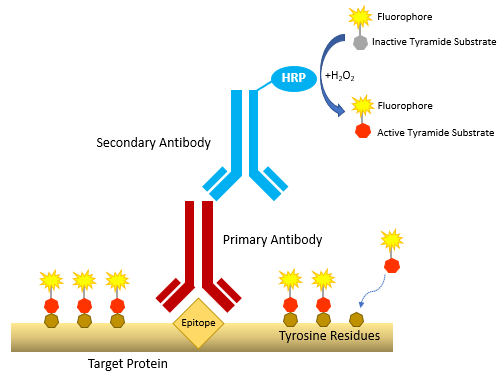 Tyramide signal amplification involves HRP-catalyzed conversion of an inactive tyramide substrate (comprising tyramide labeled with a fluorophore or a hapten such as biotin) to an active form able to covalently bind tyrosine residues on proteins at or near the HRP. Because the HRP is localized to an analyte of interest using antibodies, the resultant high density tyramide labeling at the target site enables detection of even scarce biomolecules.
