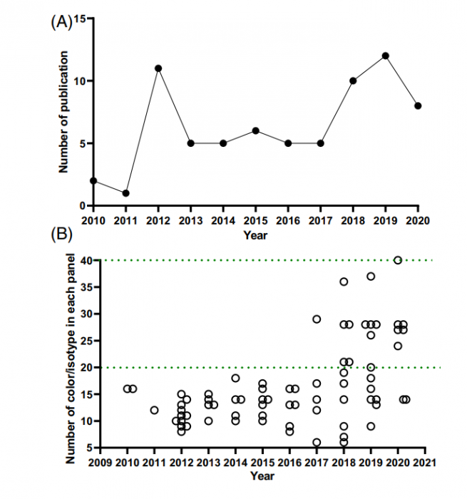 The “optimized multicolor immunofluorescence panel” OMIP publication format was launched 11 years ago as a collaborative platform to establish criteria for experimental design, data collection, and analysis [1]. An OMIP is, by definition, a peer-reviewed publication reporting on carefully validated antibodies, reagents, and protocols for the multiparameter characterization of a specific cell state or response. Together with the MIFlowCyt standard (minimal information about a flow cytometry experiment) [2] initiative, it addresses the need to generate consistently reproducible data. It is also a way to acknowledge the efforts of the developer of the panel through the citation of the publication.