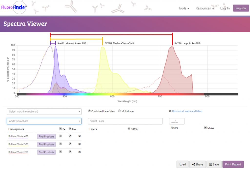 Designing a flow cytometry experiment using tandem dyes is like designing a panel with traditional dyes. Panel design tools like FluoroFinder make complex multicolor panel design easy by bringing all the available options into one place and dynamically updating those options as you select antibody/fluorochrome combinations and assign them to channels of your specific cytometer.
