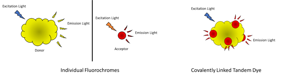 The commercial availability of antibody-linked fluorescent dyes has expanded rapidly over the past decade. Where researchers were once limited to a handful of common dyes (FITC, PE, APC, PerCP, etc.), they can now choose from an extensive list of fluorescent dye lines – spanning the light spectrum from IR to UV. Additionally, researchers can now use several tandem dyes to improve the fluorescent signal for their experiments. However, while tandem dyes can serve as powerful research tools, they can also introduce a new set of problems to consider. Here we explore the benefits of tandem dyes and review some of the difficulties that they present.