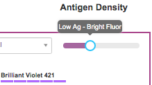 3, and VioBright FITC is rated brightness 5. FluoroFinder displays these ratings during the panel design process to help researchers make quick decisions about fluorochromes’ relative brightness. Users can also prefilter available fluorochromes by using the antigen density slider during marker selection.