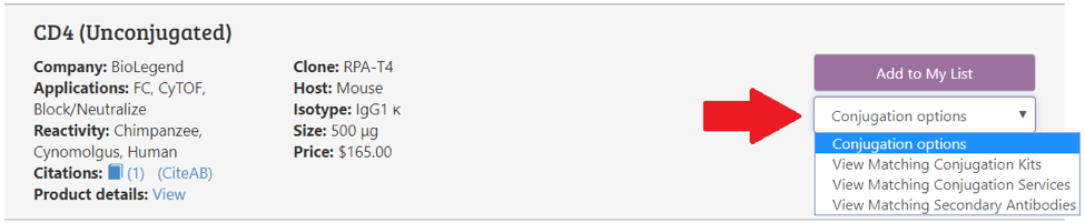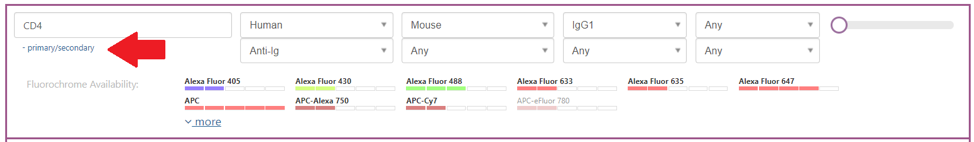 Additionally, you can match any unconjugated antibody in the FluoroFinder database to the fluorophore of your choice with the Match Pair Search Match Pair Search function. Simply search for your marker, select an antibody, and see available fluorophore options among matching secondary antibodies or conjugation kits and services.