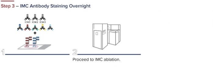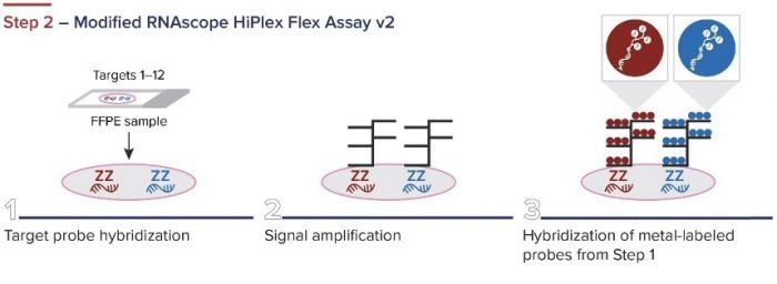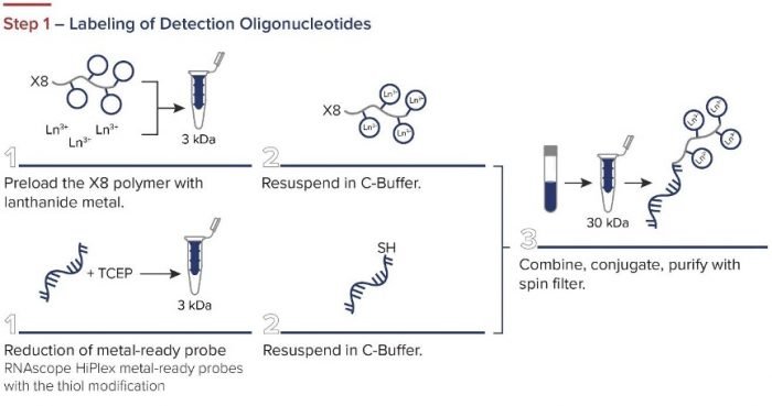 Standard BioTools has developed a simple three-step workflow for co-detecting proteins and RNA with a combination of IMC and RNAscope ISH Technology (from Advanced Cell Diagnostics, a Bio-Techne brand). First, oligonucleotides are labeled for RNAscope. The RNAscope assay is then performed, and the samples are incubated overnight with IMC antibodies. A standard image analysis pipeline is used for deciphering the data.