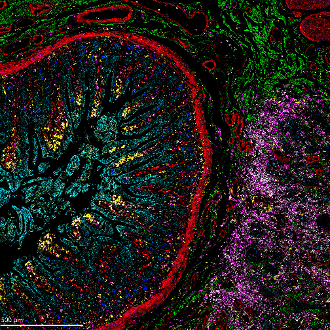 Figure 1. IMC staining of pancreatic ductal adenocarcinoma (PDAC) tissue showing 7 markers: aSMA (red), HLADR (yellow), E-cadherin (cyan), collagen 1 (green), CD68 (magenta), INOS (blue) and Granzyme B (white).