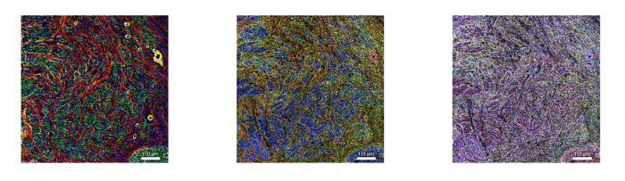 Figure 3. IMC and RNAscope co-detection of a breast cancer sample. IMC (left panel) showing the structural markers Collagen 1 (red), E-cadherin (green), and aSMA (yellow), plus DNA (blue). RNAscope (middle panel) showing UBC (red), B2M (green), and GAPDH (blue). Maxpar IMC Cell Segmentation kit staining (right panel).
