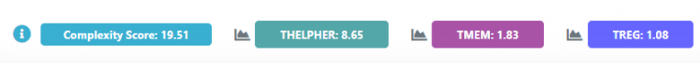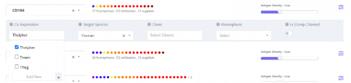 On the other hand, the complexity matrix relates to a culmination of all the similarity index values and assesses the similarity of the spectral signatures of all the fluorophores within a single panel or within co-expression groups. With access to FluoroFinder’s IntelliPanel, users can assign each marker to one or more co-expression groups. In this example, in a list of 15 markers, there is a dump channel and three distinct subpopulations of cells in which each of these markers is either positive or negative, “Thelper”, “Treg” and “Tmem”. The best rule of thumb is to include a marker in a co-expression group if the subpopulation will be displayed on the same analysis plot. For example, CD194, CD196, IFN-g, and IL-4 are generally used to define T-helper 1 (Th1) and T-helper 2 (Th2) cells. Even though some of these markers are positive or negative on Th1 or Th2 respectively, in analysis, they will still be displayed on the same plot, even if it is as a CD194-/CD196- population in the case of Th1 cells. The spillover spreading error still needs to be anticipated, even in a negative population.