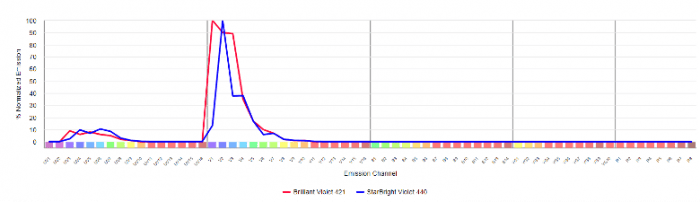 Within FluoroFinder’s Spectra Viewer, users can visualize the similarity matrix for their panel. For example, if we are considering using Brilliant Violet 421 and StarBright Violet 440 on different markers within a single panel, I can select these fluorophores to display the spillover matrix. 1.0 indicates 100% similarity, so the similarity index score of 0.8 indicates that Brilliant Violet 421 is 80% spectrally similar to StarBright Violet 440. Thus, I would not want to dedicate these fluors to markers within the same co-expression group or cell subset. However, if this fluorophore combination is necessary, with proper panel optimization testing, these two fluors may be different enough to dedicate them to different makers in the same assay that are no co-expressed or where one fluorophore is dedicated to the dump channel, which will be excluded from the analysis.