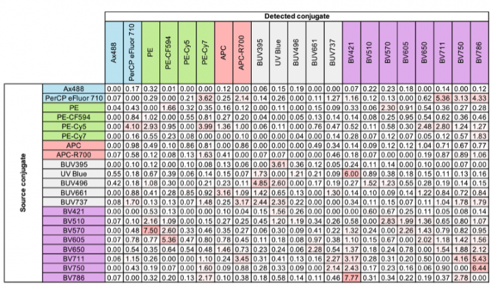 The spillover-spreading matrix (SSM), or spillover matrix, is a table of values that represents the degree to which a fluorophore spills into another detection channel on an instrument. This table is a component that mathematically estimates the degree to which that spillover will lead to the spreading error phenomenon. The values in the matrix represent a standard deviation of spillover, called signal spread, and are not on an absolute scale. For the best explanation and more information on the math used in this calculation, you can refer to the FlowJo website1 or the quintessential paper from Nguyen and Perfetto2 from 2013. Spillover spreading values can be used in the panel design process as a guide to which combinations of fluorophores are most compatible to report markers that will be co-expressed on the same event or cell and which combinations have dangerously high spectral spillover. Combinations of dyes with high spectral spillover should either be assigned to markers with no co-expression or avoided altogether. It’s important to understand that this matrix reflects the instrument specifications as much as reflects the spillover related to the physical properties of the fluorophore.