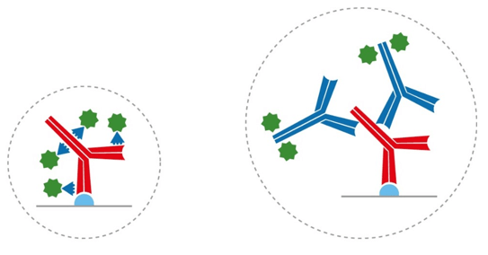 Figure 2. Indirect detection with a conventional IgG and a labeled VHH (left), and with two conventional IgG antibodies (right). Using VHH antibodies can reduce linkage error.