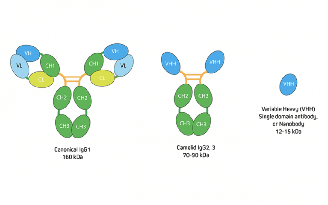 Figure 1. Comparison of conventional IgG with camelid immunoglobulins and VHH. Image provided by Jackson ImmunoResearch.