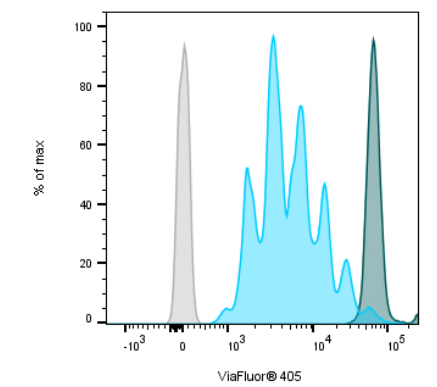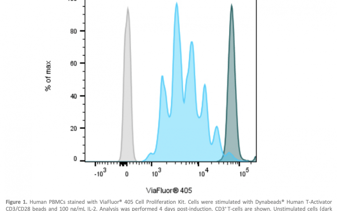 Figure 1. Human PBMCs stained with ViaFluor® 405 Cell Proliferation Kit. Cells were stimulated with Dynabeads® Human T-Activator CD3/CD28 beads and 100 ng/mL IL-2. Analysis was performed 4 days post-induction. CD3+ T-cells are shown. Unstimulated cells (dark peaks) and unstained cells (gray) are included for comparison. Image provided by Biotium.