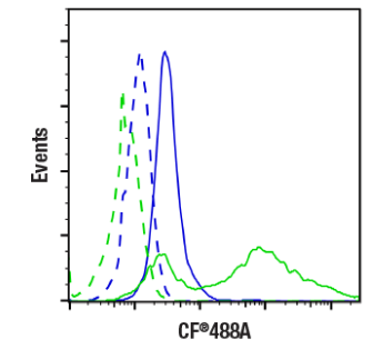 Figure 2. Flow cytometric analysis of Jurkat cells, untreated (blue) or treated with Staurosporine (1 μM, 3 hours, green), unlabeled (dashed lines) or labeled with TUNEL Assay Kit (Fluorescence, 488 nm) (solid lines). Image provided by CST.