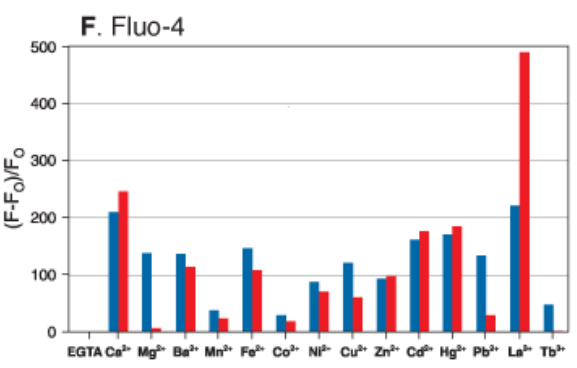 Action potentials are regulated by calcium, sodium and potassium channels working in concert to propagate signaling and maintain homeostasis in muscles and the nervous system. Cellular probes called ion indicators will have an affinity (Kd) for a particular ion, however they are never specific for that ion. The most popular single wavelength (one excitation peak, one emission peak that becomes brighter when bound) calcium indicator is Fluo-4 developed in the lab of the late, great Roger Tsien. The graph below is taken from the Molecular Probes handbook showing the relative intensity change for 1uM (blue bar) and 100uM (red) ion concentrations. The element that elicits the strongest response from Fluo-4 is actually Lanthanum. Luckily for us, there shouldn’t be any lanthanum in a healthy human biological sample. Second to that is calcium. This graph can also be misleading since the element most likely to cause competition for calcium in a biological sample is actually magnesium, which was assayed at a 100x higher concentration to calcium although they are plotted together on the same scale. So, we say these indicators are selective, not specific. Also, because ion indicators chelate the ion they are sensing, it will deplete that ion from bioavailability in the sample, which can be harmful to cell health in long-term experiments.