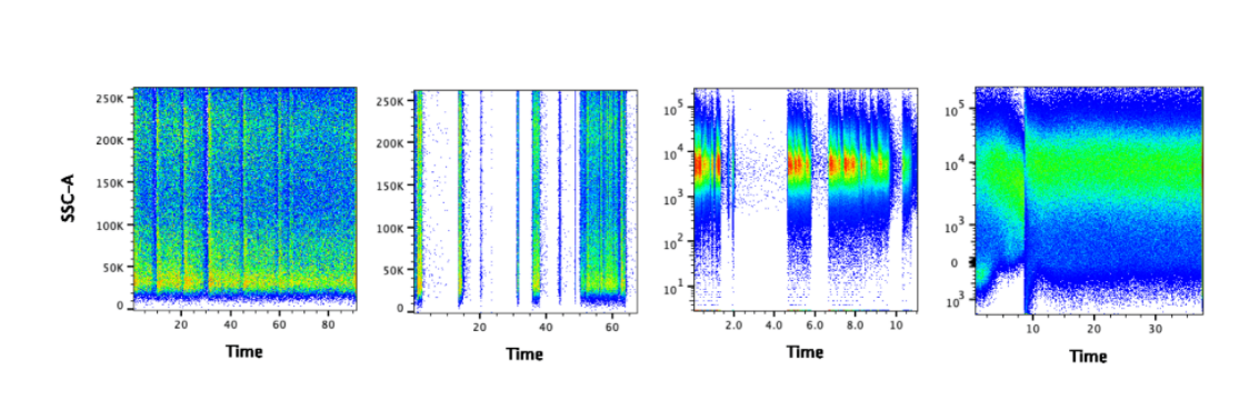 Small air bubbles, cell clumps, and air passing through the laser beams at the end of a sample run can all scatter and deflect fluorescent light in a way resembling a positive event. An effective way to identify these artifacts is to use the time gate: a plot of SSC ( side scatter) or FSC ( forward scatter) versus time. Spikes and gaps in the data indicate the presence of clogs or air bubbles. Gating should be restricted to unaffected regions where the signal is stable and uninterrupted.  Figure 1. The gaps suggest there may have been clogs. It may be possible to salvage the data by gating on the portion of data where the signal is steady.