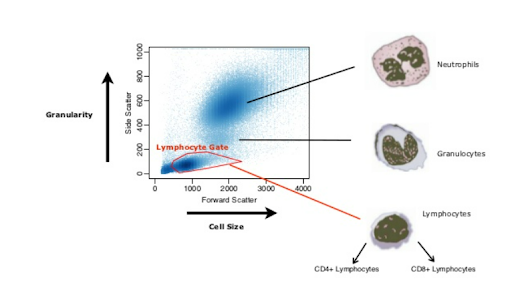Forward (FSC) and side scatter (SSC) density plots are used to derive information about the size and complexity (granularity) of a cell population. Drawing a “loose” gate on the FSC or SSC plots helps to eliminate only those events that are not of interest, avoiding the loss of any information about the cell population under scrutiny.  Figure 2: Distinguishing Lymphocytes from granulocytes and neutrophils, excluding cell debris. Nikolas Pontikos, 2012