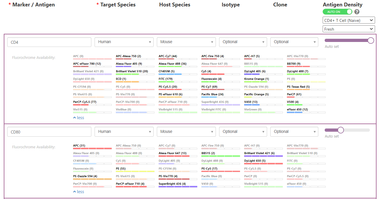 Antigen density refers to the number of target molecules in a specific cell subset. Antigens expressed at high levels are densely populated on the cell, making them more readily available for antibody detection. Understanding antigen density is important for any cell-based experiment using fluorescent antibody detection, as markers with high density will produce a stronger (brighter) signal and should therefore be paired with dimmer fluorophores. Here we review methods for measuring antigen density and demonstrate how FluoroFinder is integrating bioinformatics from Astrolabe Diagnostics (based on Amir et al. 2019) to improve our multi-color flow cytometry Panel Design Tool.