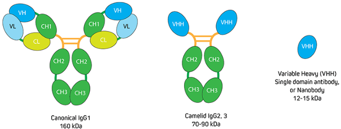 Figure 1. Comparison of conventional IgG with camelid immunoglobulins and VHH. Image provided by Jackson ImmunoResearch.
